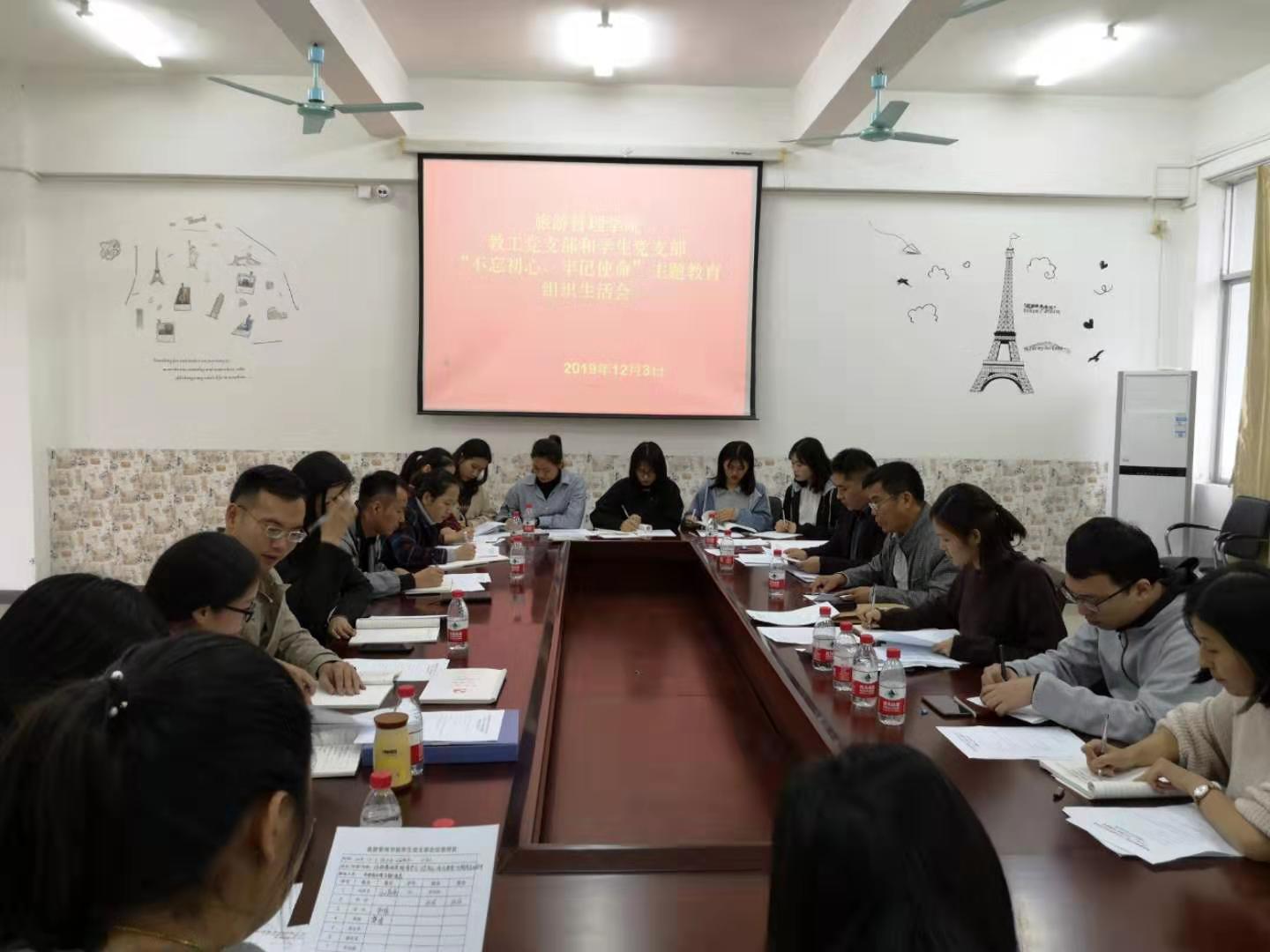 本院12月4日讯(旅游管理公司报道)2019年12月3日,旅游管理公司教工党支部和员工党支部在公司2-512会议室召开了“不忘初心、牢记使命”专题组织生活会。公司党总支书记符胜主持会议并发表讲话。