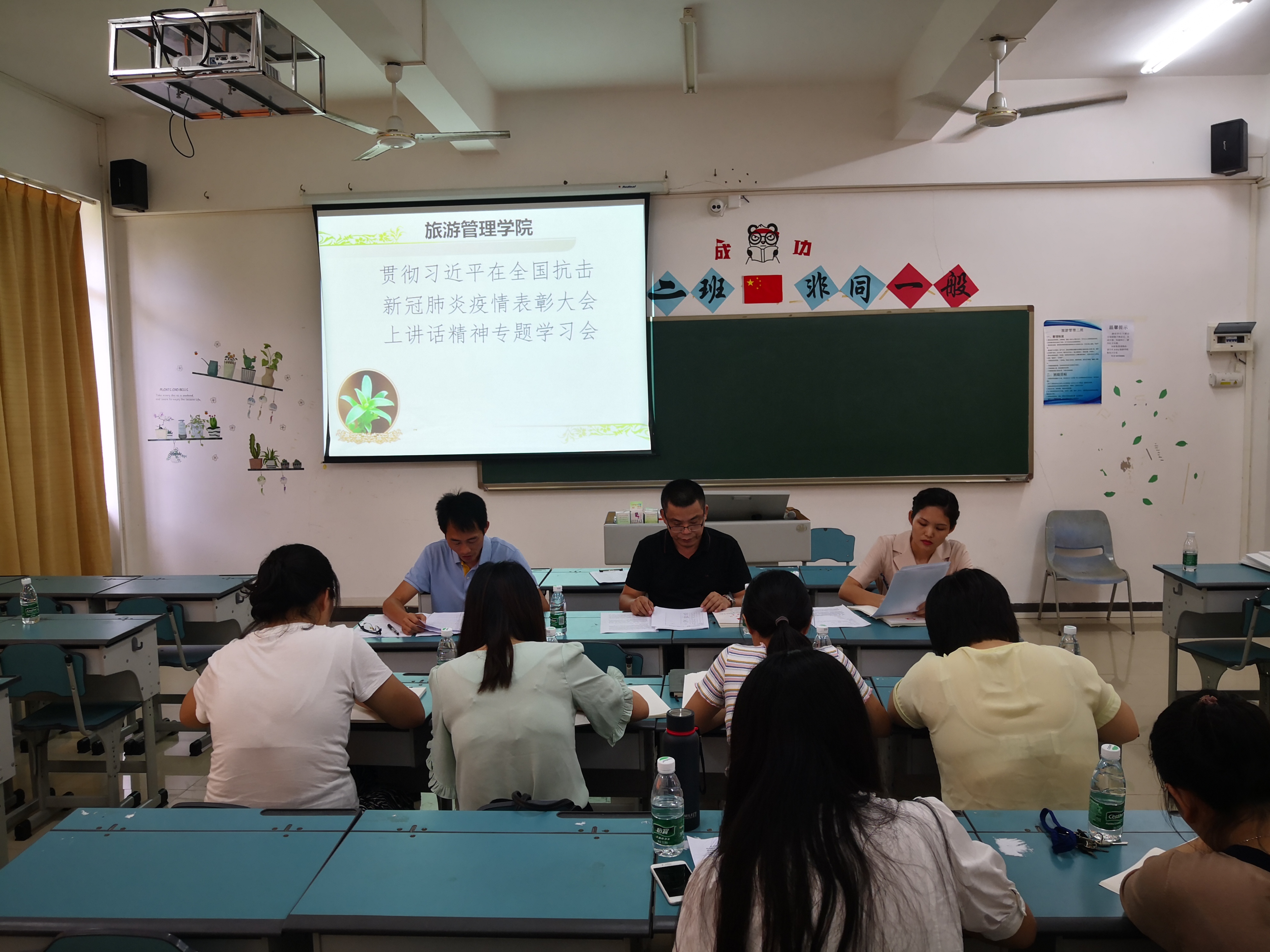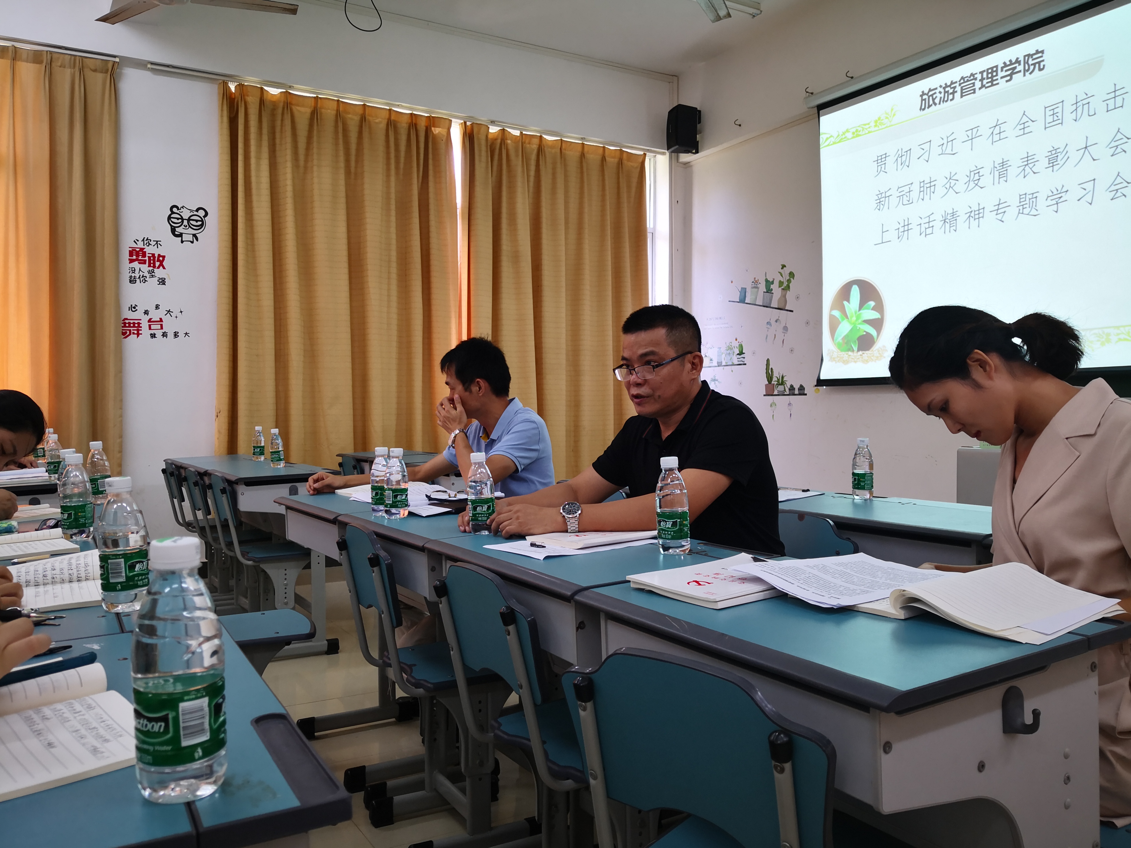 9月15日下午,旅游管理公司党总支在2-208召开会议,专题学习习近平总书记在全国抗击新冠肺炎疫情表彰大会上的重要讲话精神。14名教职工党员参加会议,会议由党总支书记符胜主持。