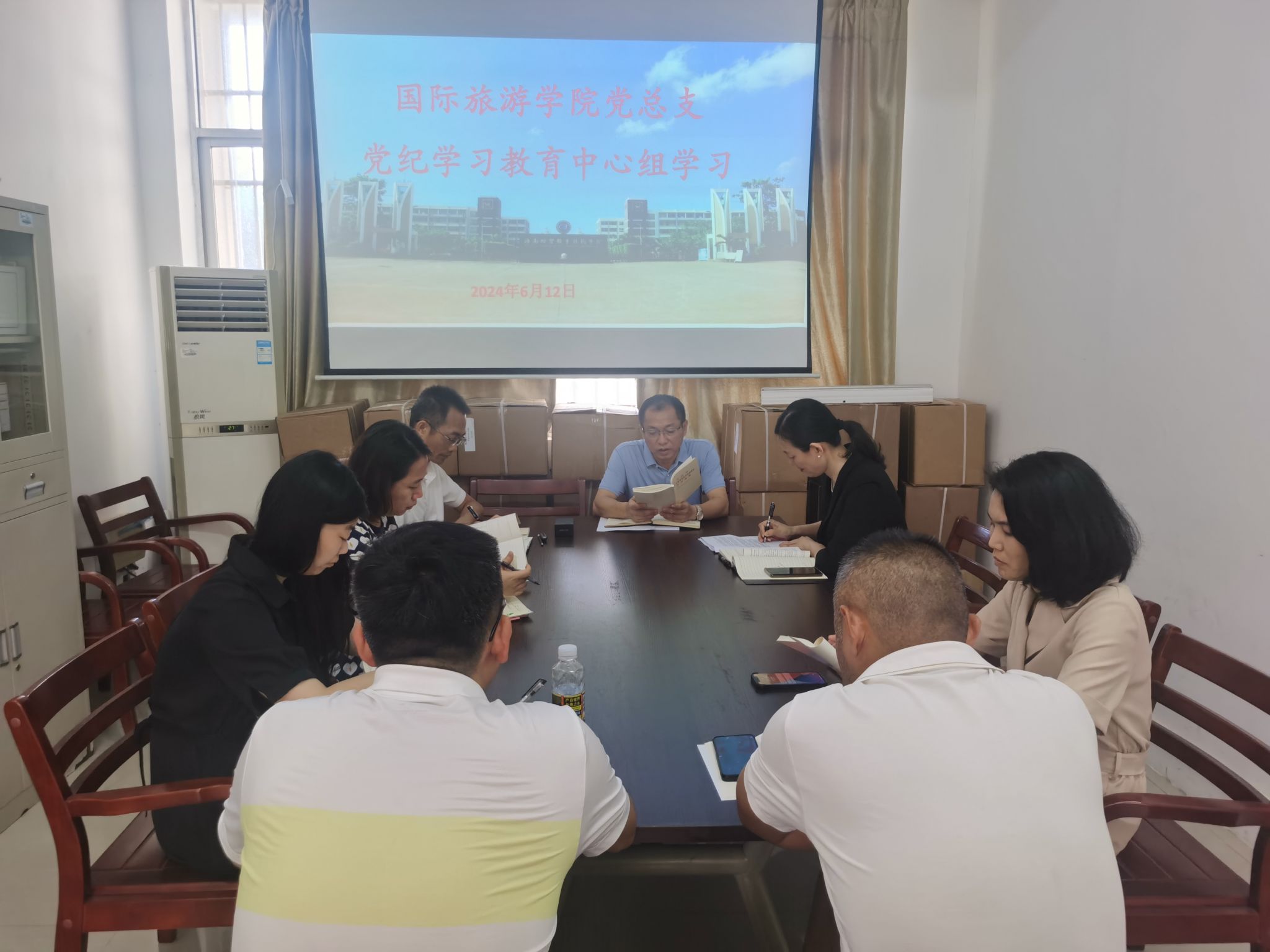 2024年6月12日上午,国际旅游公司党总支在2-210会议室召开党纪学习教育中心组学习会。公司党总支委员和员工党支部教师党员参加会议。会议由党总支书记孙金主持。