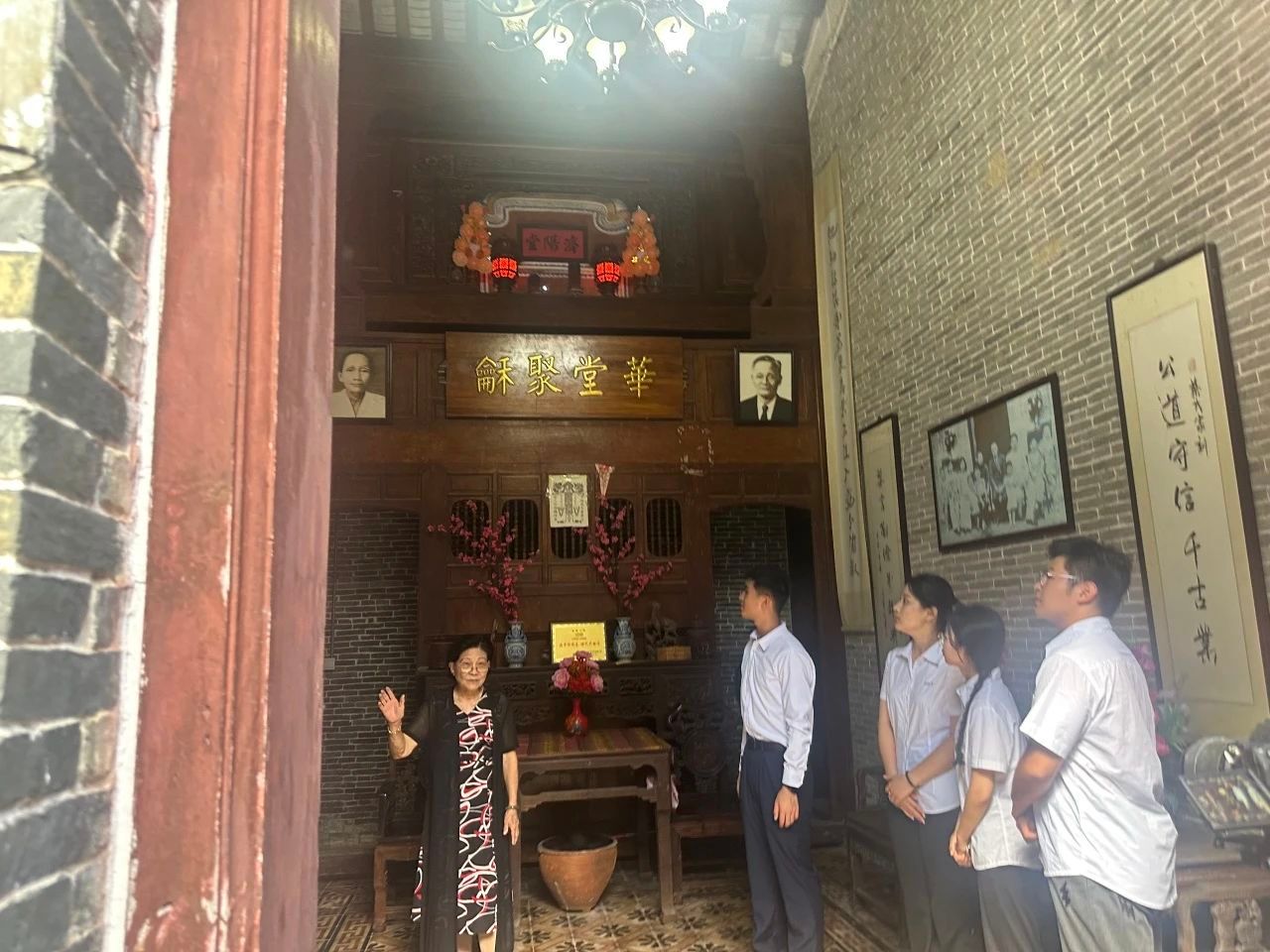 师生们在蔡家宅第四代主人蔡王普君带领下,沿着中轴线参观“四厅六房”布局,重点学习蔡家宅“公阁”祭祖文化、家训楹联及防卫智慧。宅内悬挂的“公道守信千古业,婆言勤俭万年兴”祖训,生动诠释了蔡氏家族“诚信立身、勤俭持家”的治家理念,其背后折射出的华侨群体“落叶归根、反哺故土”的情怀,令在场师生动容。