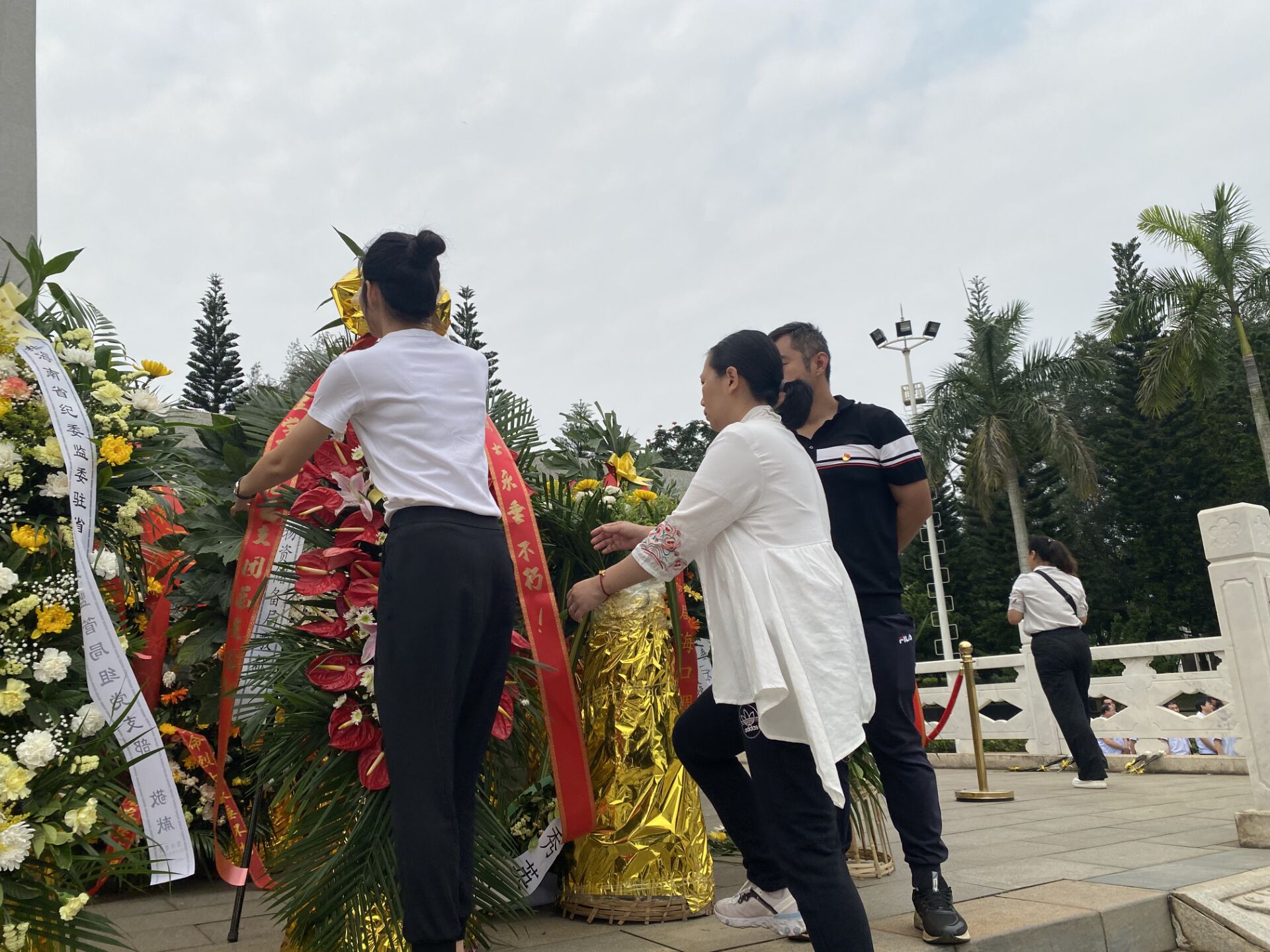 随后,刘萍男、符珍向解放海南岛战役烈士纪念碑敬献花篮,整理挽联。全体师生面向革命烈士纪念碑鞠躬三次,并顺时针环绕一周,瞻仰革命烈士纪念碑。