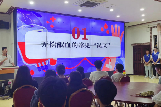 讲座开始,员工会主席赵路结合自身实际,给大家就无偿献血常见“误区”、无偿献血的基本知识、献血好处、献血流程以及正规的献血途径五个方面进行科普,倡导大家积极参与,尤其在每年的6月14日为世界献血日,同学们更应当积极主动的参与进来,通过献血拯救他人生命,传递青春正能量。然后通过几轮献血知识趣味问答与在场同学互动,引发志愿者的积极思考,寓教于乐,充分调动了全场员工的积极性,引发强烈共鸣。