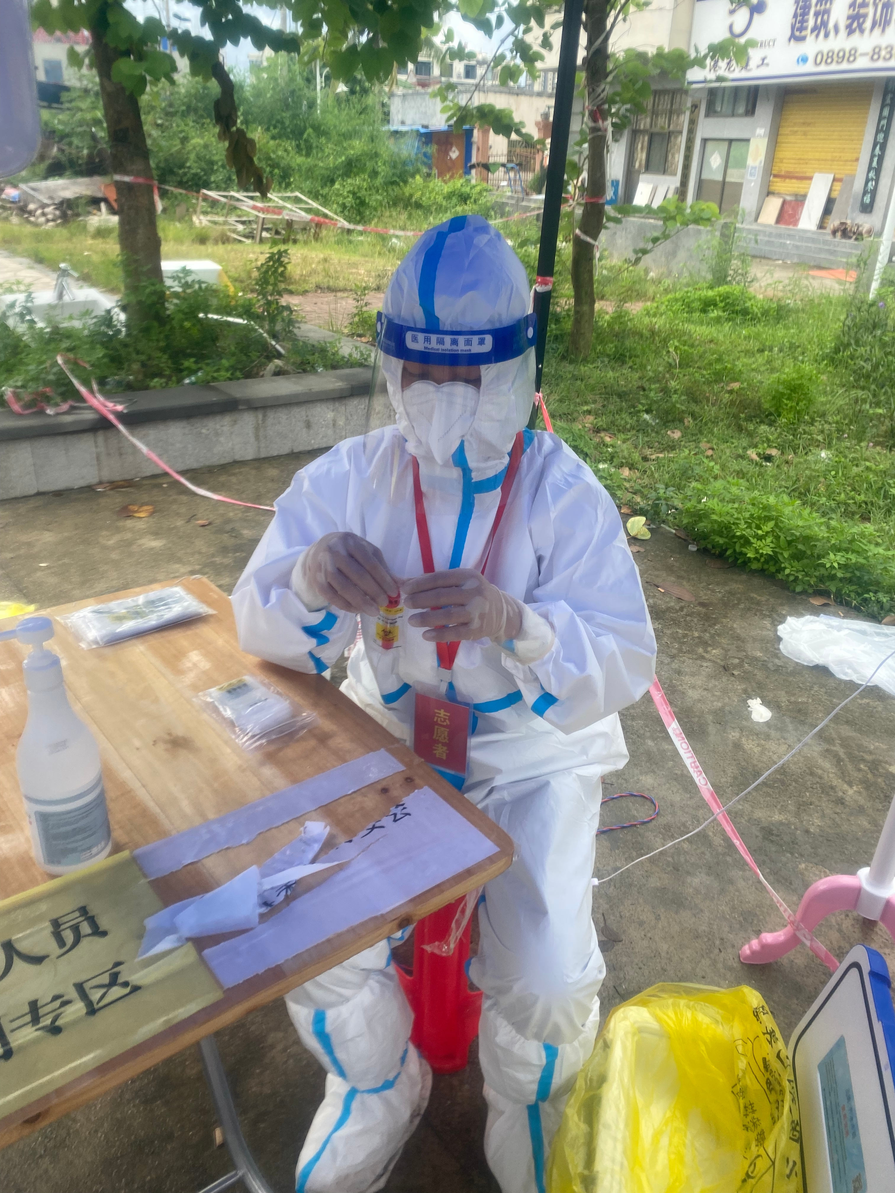 ▲21级酒管专升本黎丽芳在陵水县文罗镇当志愿者协助核酸检验