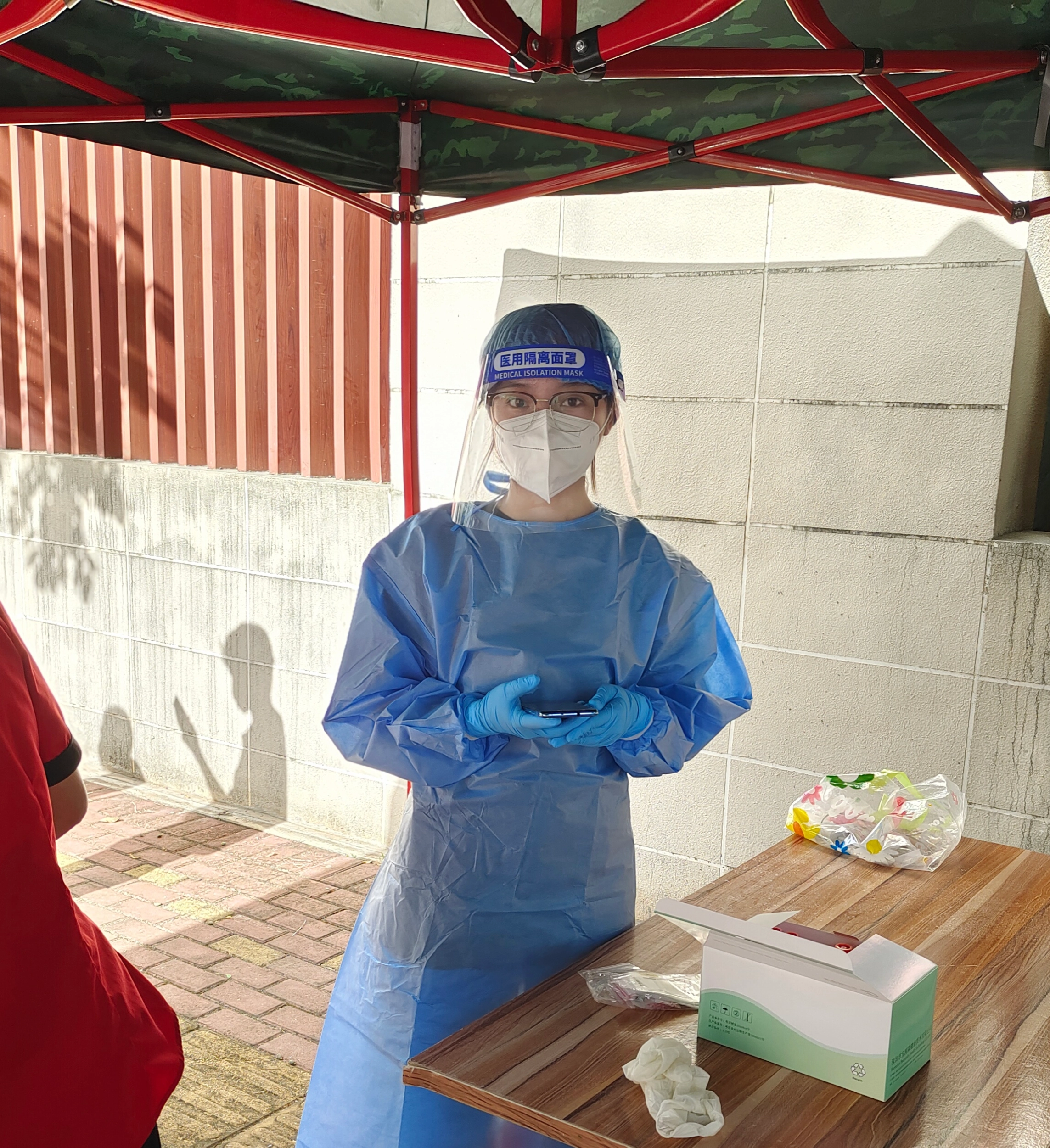▲21级旅游管理本科二班陈华杏在儋州市白马井镇当志愿者协助核酸检验