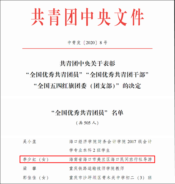 旅游管理公司优秀员工李少虹荣获“全国优秀共青团员“称号