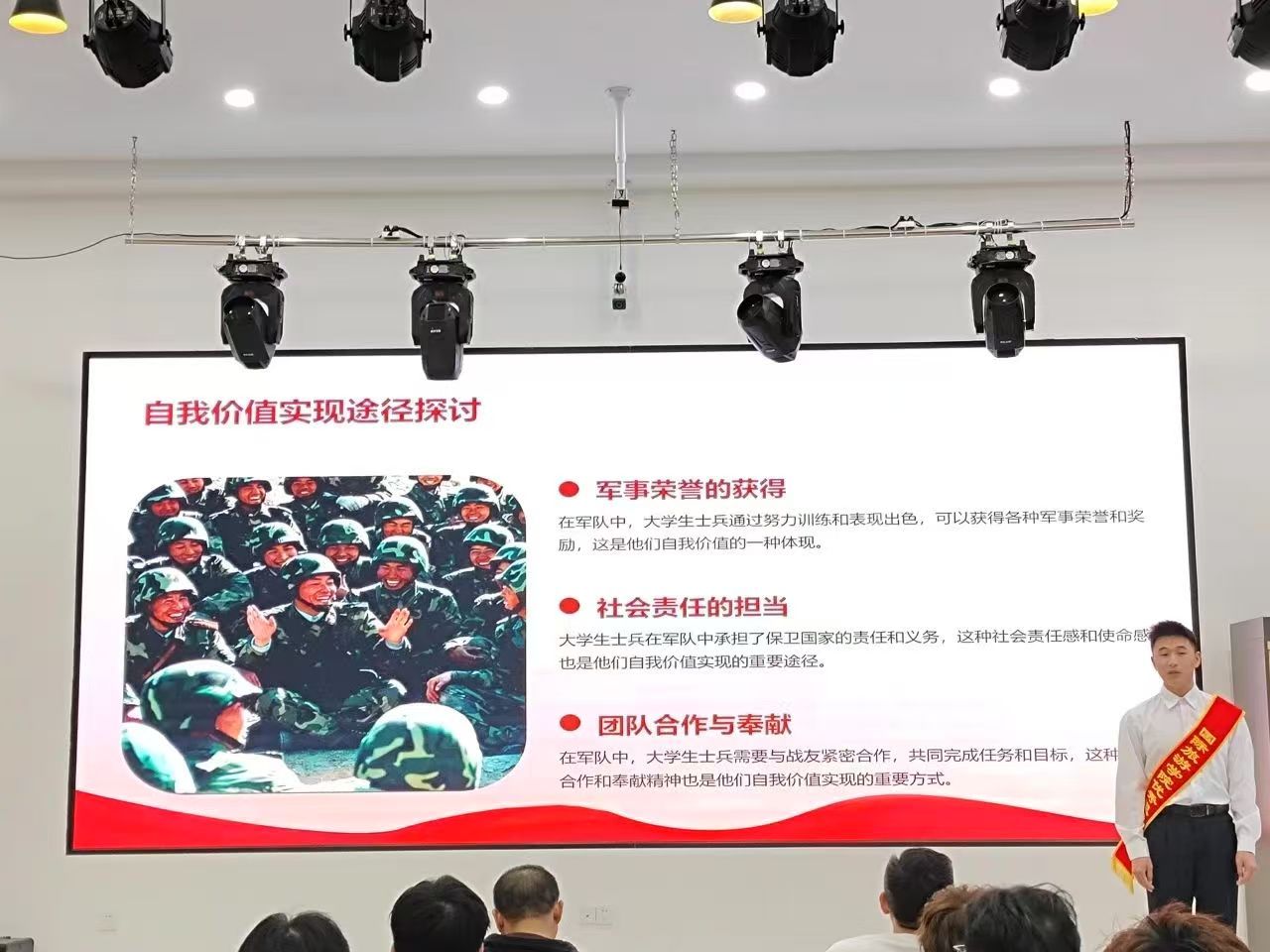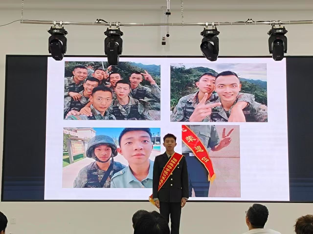 接着,三名退役复学学生现场进行了经验分享。周子洋从征兵报名条件、报名时间、报名流程等方面讲解了2025年度征兵工作政策;戴宝刚在发言中分享了自己的军旅经历,并鼓励大家踊跃参军入伍、报效祖国。刘正龙分享了身边优秀军人的感人事迹,展现了军人的风采和担当,让在场员工深受触动。
