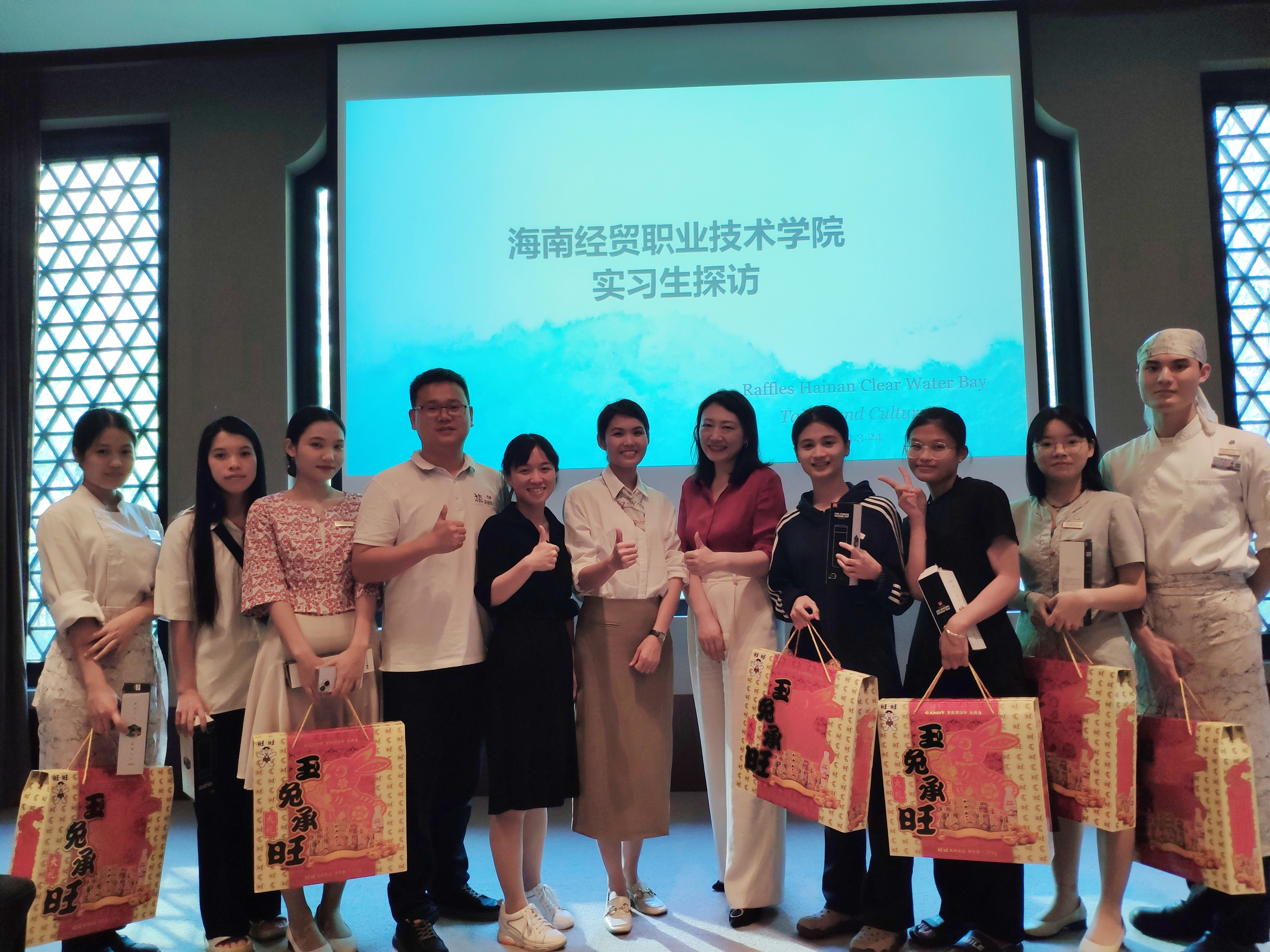 (与陵水莱佛士酒店企业代表和实习生合影)