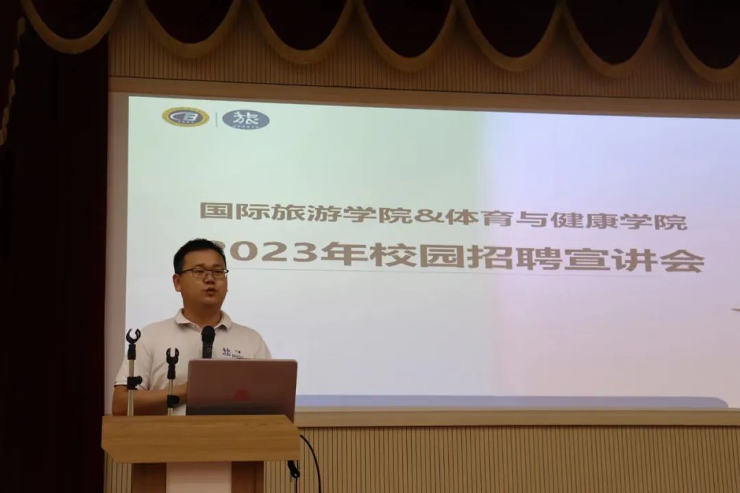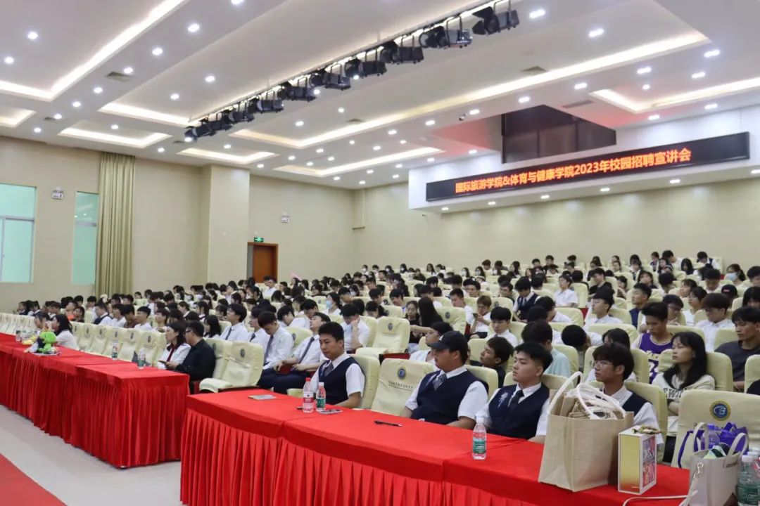 为进一步推动就业工作,使员工获得更多优质就业资源,4月25日,2023年第二场实习就业宣讲会在海经贸图书馆二楼报告厅顺利举办。本次宣讲会联合体育与健康公司共同举办,国际旅游公司党总支书记孙金、体育与健康公司经理胡友波、国际旅游公司党总支副书记刘萍男出席宣讲会,辅导员张一兵、张晓阳以及毕业班员工320余人到场。