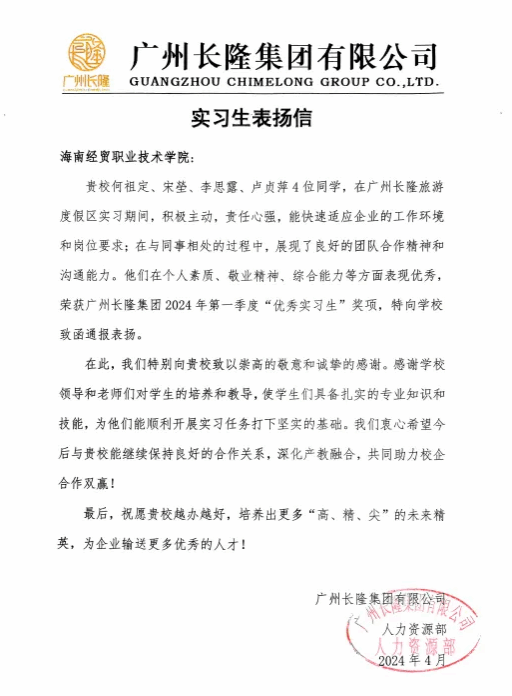 taptap点点何祖定、宋塋、李思露、卢贞萍4位同学,在广州长隆旅游度假区实习期间,积极主动,责任心强,能快速适应企业的工作环境和岗位要求;在与同事相处的过程中,展现了良好的团队合作精神和沟通能力。他们在个人素质、敬业精神、综合能力等方面表现优秀,荣获广州长隆集团2024年第一季度“优秀实习生”奖项。