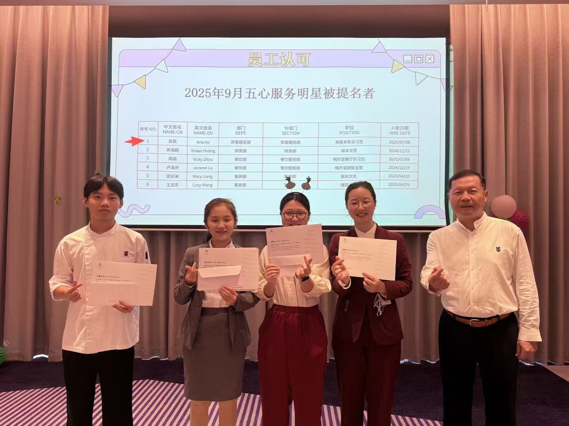 符照敏同学荣获海口费尔蒙酒店2025年10月份月度优秀人才优秀实习生表彰。