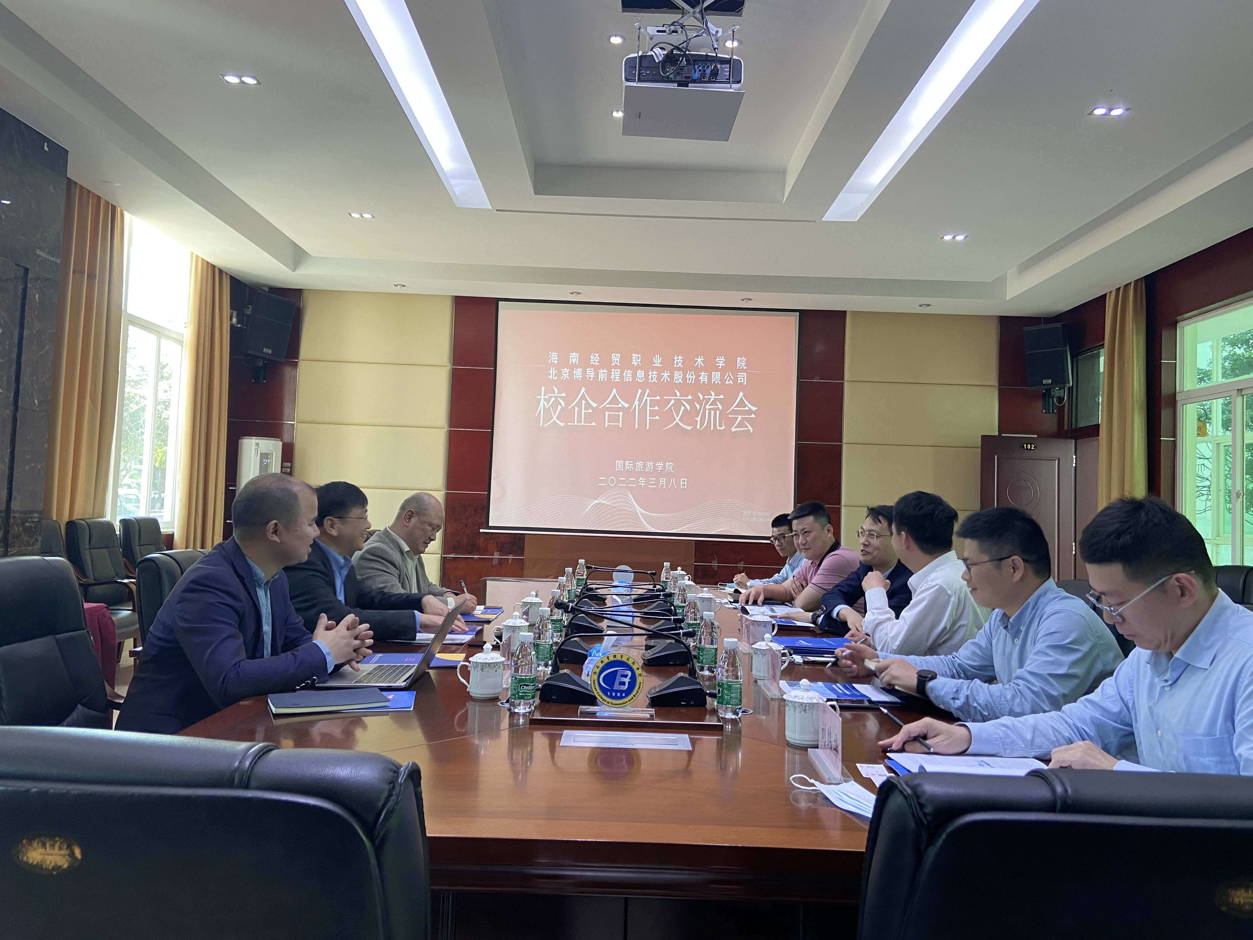 2022年3月8日下午,北京博导前程信息技术股份有限公司(以下称博导前程)陈栋总裁一行来公司洽谈交流。会议由吉家文经理主持,公司产学研合作处赵刘处长、taptap点点陈松副经理、继续教育公司范迪峰副经理、旅游管理专业教研室刘纬华博士及旅游管理专业群“双高”建设小组秘书李飞老师出席会议。