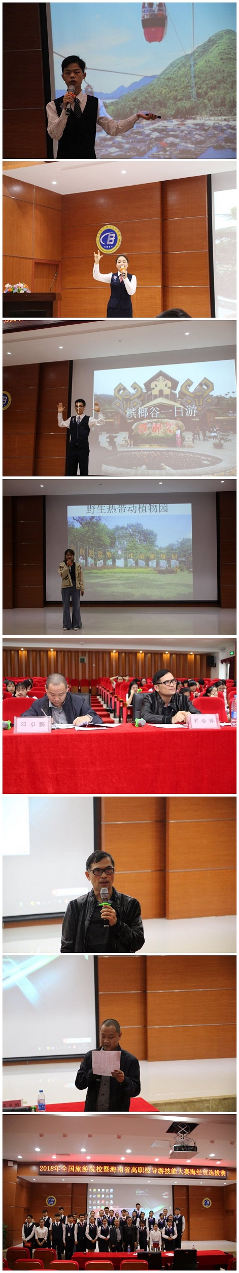 参加此次技能大赛的共有十二名选手。大赛分为自选导游讲解和才艺展示两个环节,选手有序上场,各自大放异彩,充分的展现了自己所学的知识。选手都带有自己特色色彩的介绍方式,为观众详细的介绍了蜈支洲岛、槟榔谷等海南著名的4A及5A级旅游景区。随着选手们绘声绘色的讲解,让观众及评委仿佛身临其境。