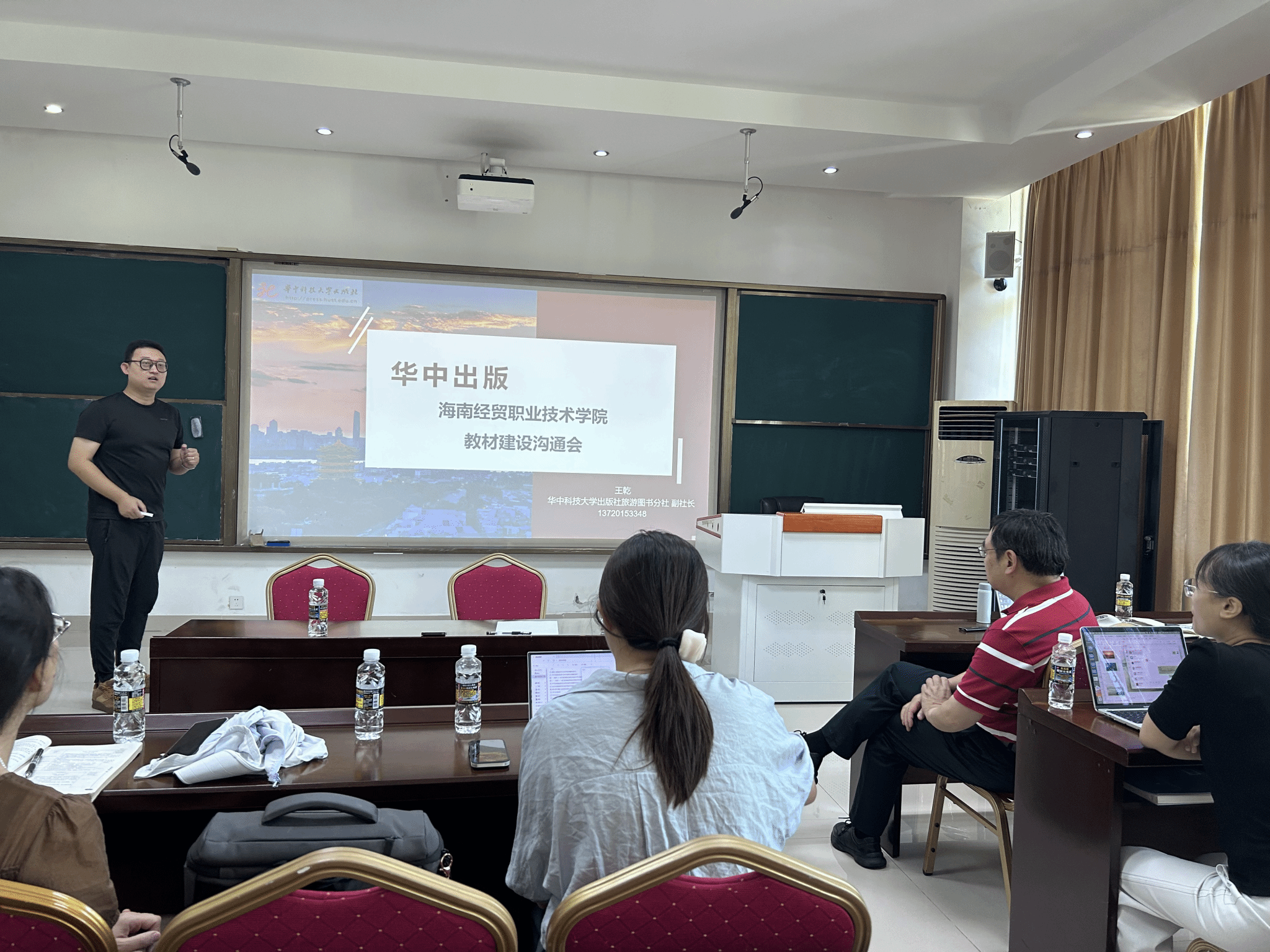 在此次指导工作中,王昆欣教授围绕教材建设、专业群“双高”工作、职业本科评估筹备、青年教师科研课题申报、新专业建设以及职业院校旅游类实训教学条件建设标准等多个方面进行了深入指导。他与华中科技大学出版社旅游图书分社副社长王乾老师深入交流,强调教材建设应紧跟时代步伐,紧密结合行业需求,注重培养员工的实践能力和创新思维,并分享了教材编写经验,为专业教师提供了有益参考。