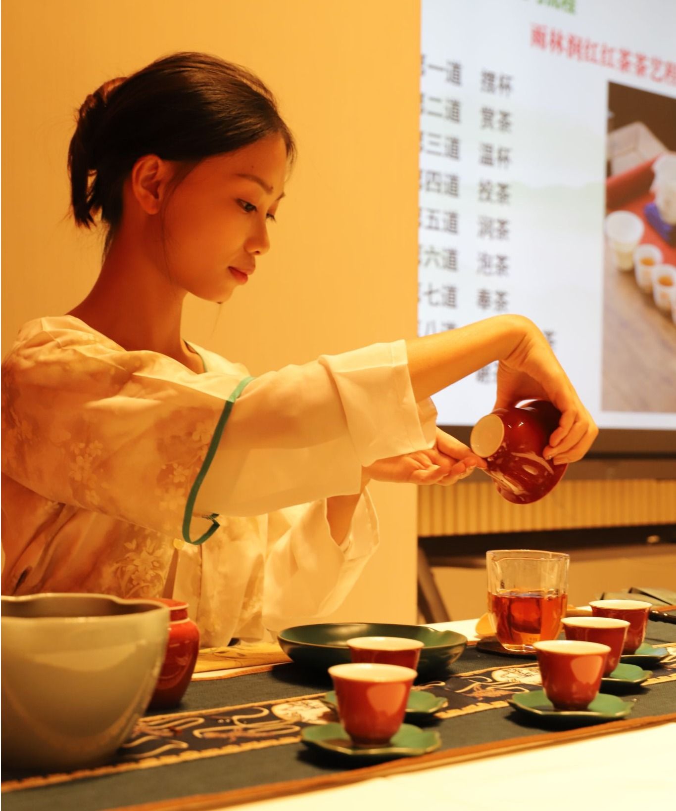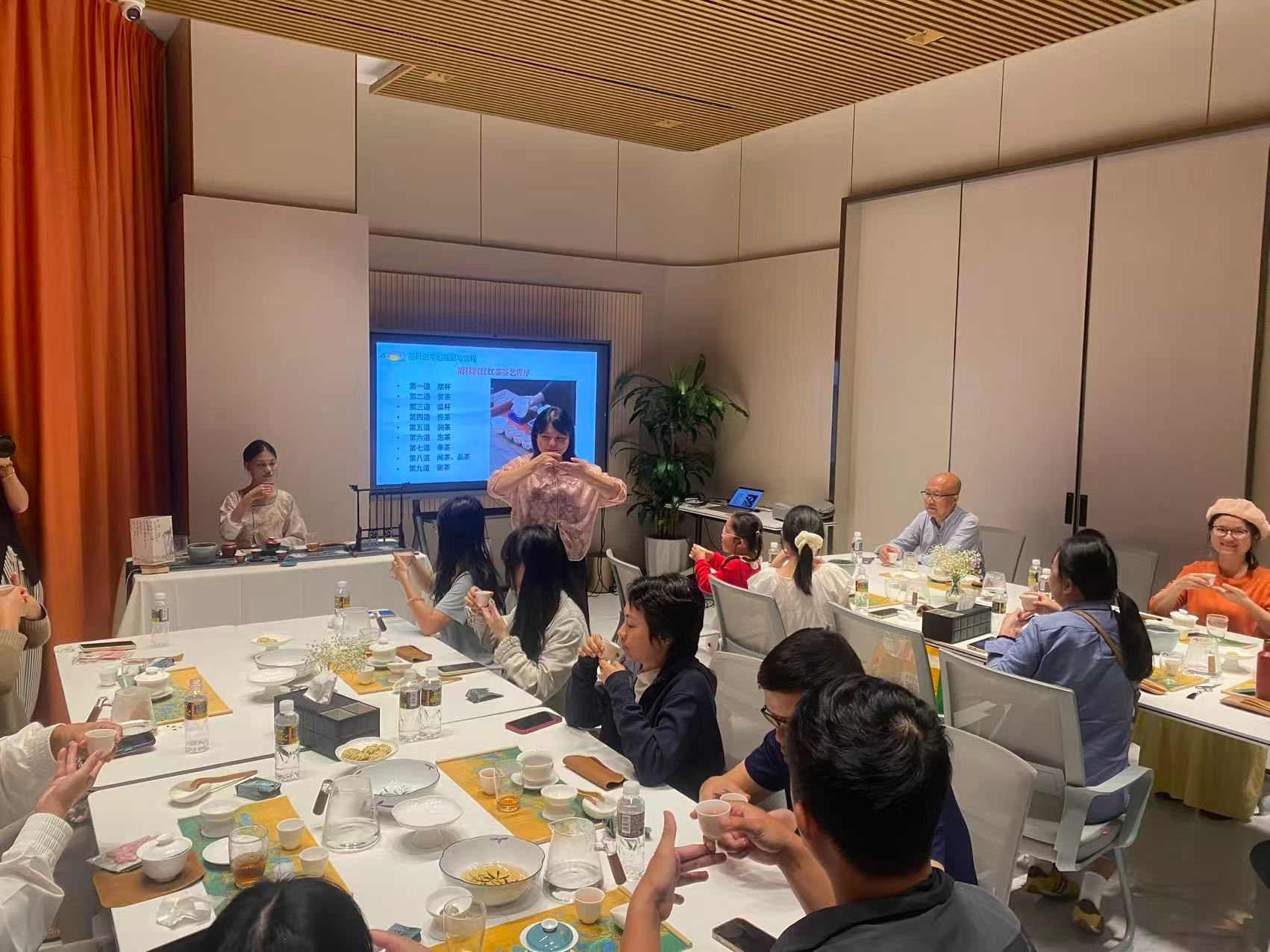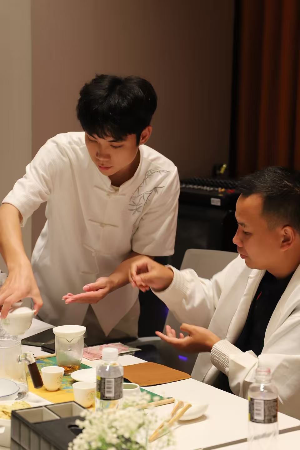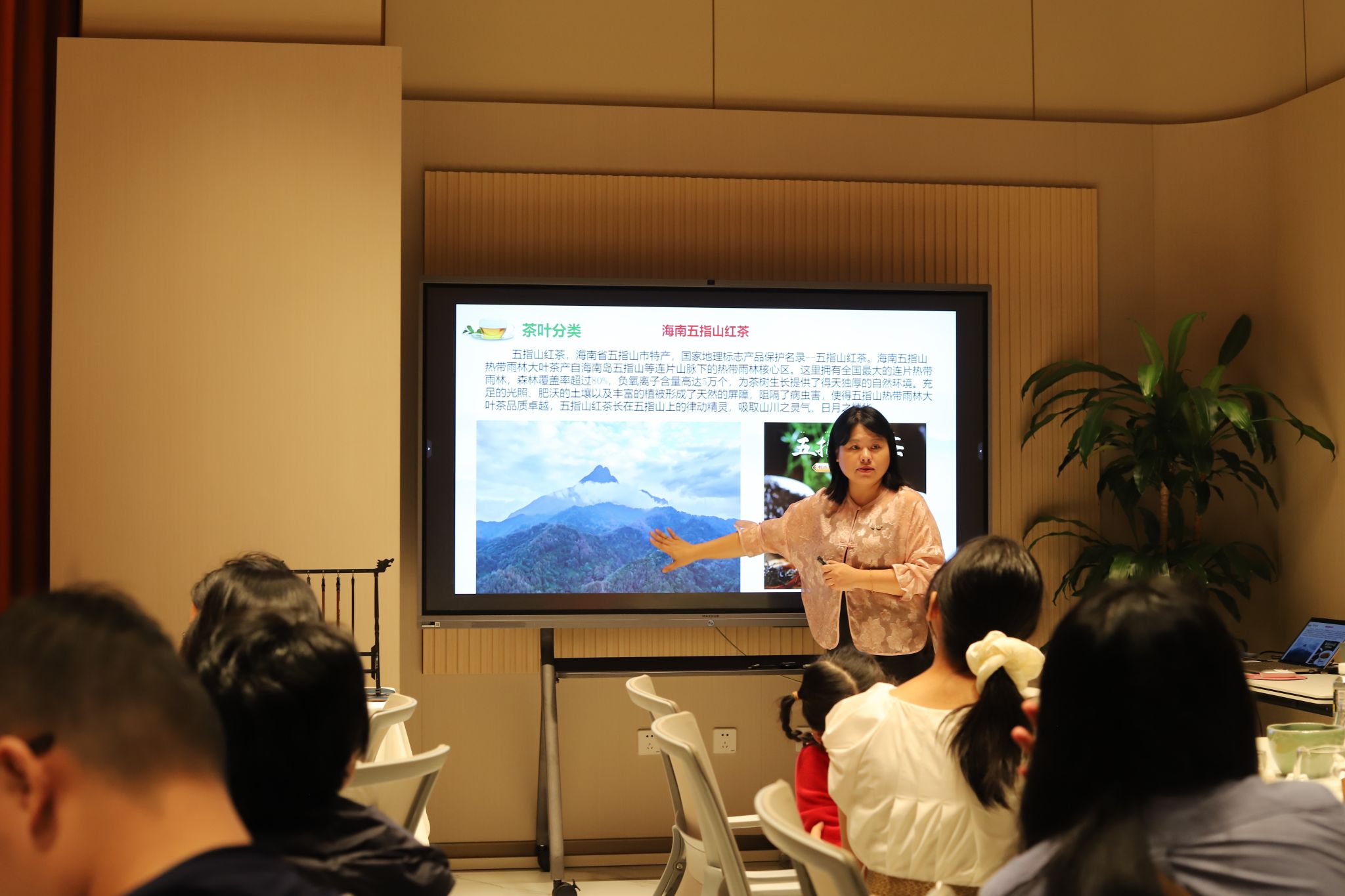 活动两大篇章层层递进、相映成趣。第一篇章 “道启智慧” 中,嘉宾跟随国学大师的脚步,聆听《道德经》的智慧,品味做人、做事、做管理的“三味”人生。第二篇章 “茶润心田” 则聚焦海南本土茶文化,taptap点点林文超老师作为特邀茶艺师,带领员工团队登台展演。以五指山雨林红茶为媒,从茶的起源、雨林产区特质,到冲泡技艺的温杯、置茶、注水、出汤,深入浅出解析茶文化中的生活哲学与人文温度;现场更设置互动体验环节,嘉宾在师生指导下亲手冲泡,感受茶汤的醇厚回甘与茶艺的美学韵律,沉浸式领略海南五指山雨林红茶的独特魅力,实现思想与感官的双重浸润。